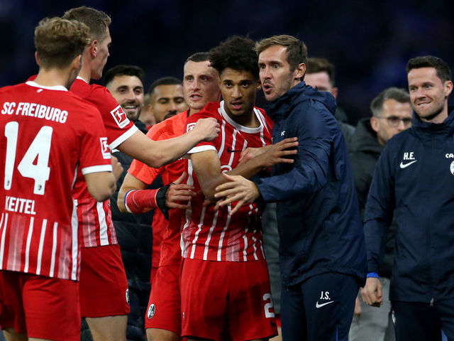 Kevin Schade SC Freiburg right footed shot from the left side of the box to the bottom left corner. Sandro Schwarz looks ahead to the upcoming game against Freiburg. Hertha BSC has won 4 and Freiburg.